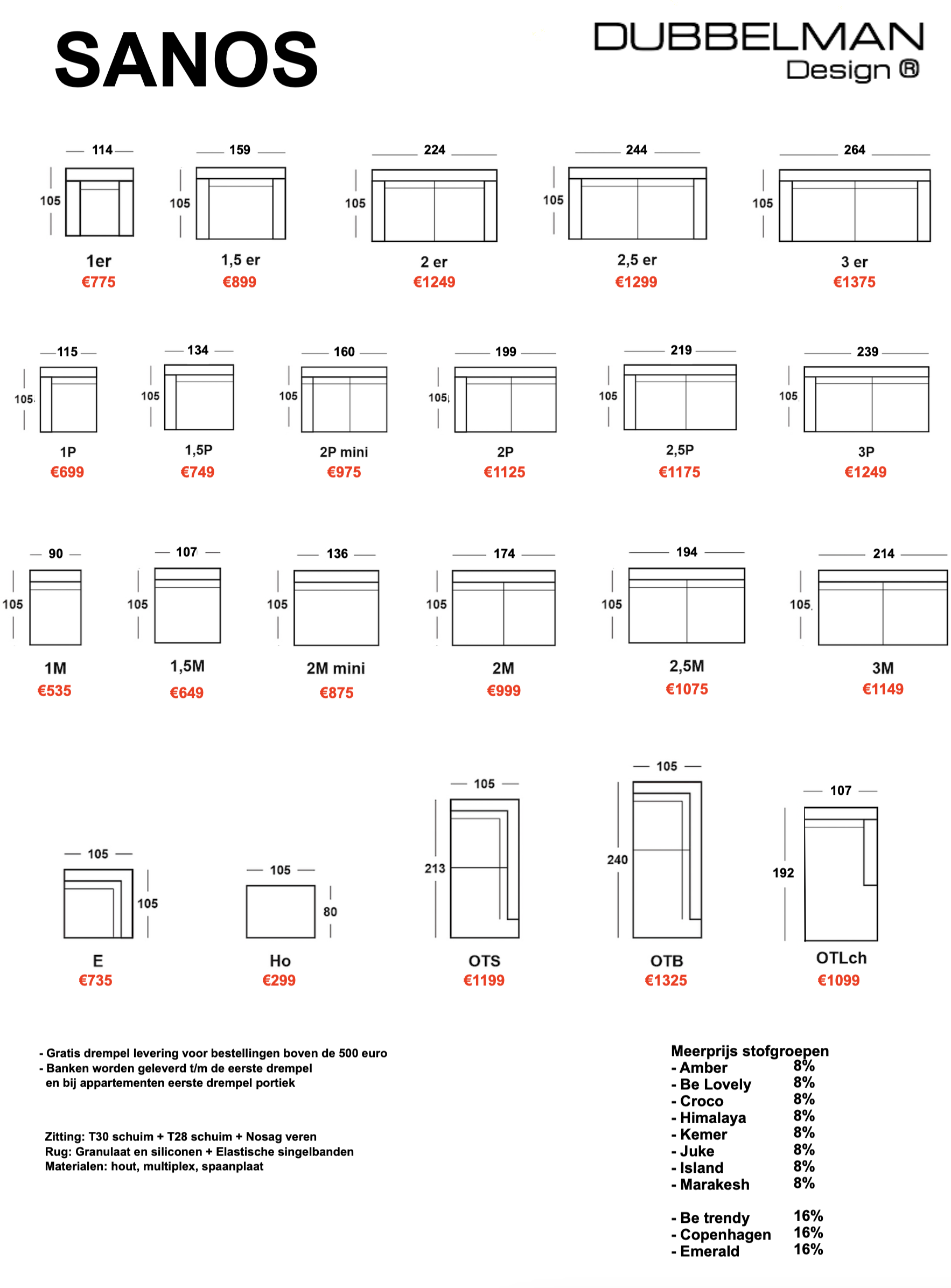 Banken kunnen in onze winkel zelf samengesteld worden in een gewenste opstelling, materiaal en kleur. Zie elementenoverzicht voor alle beschikbare elementen, alle delen kunnen gespiegeld worden.