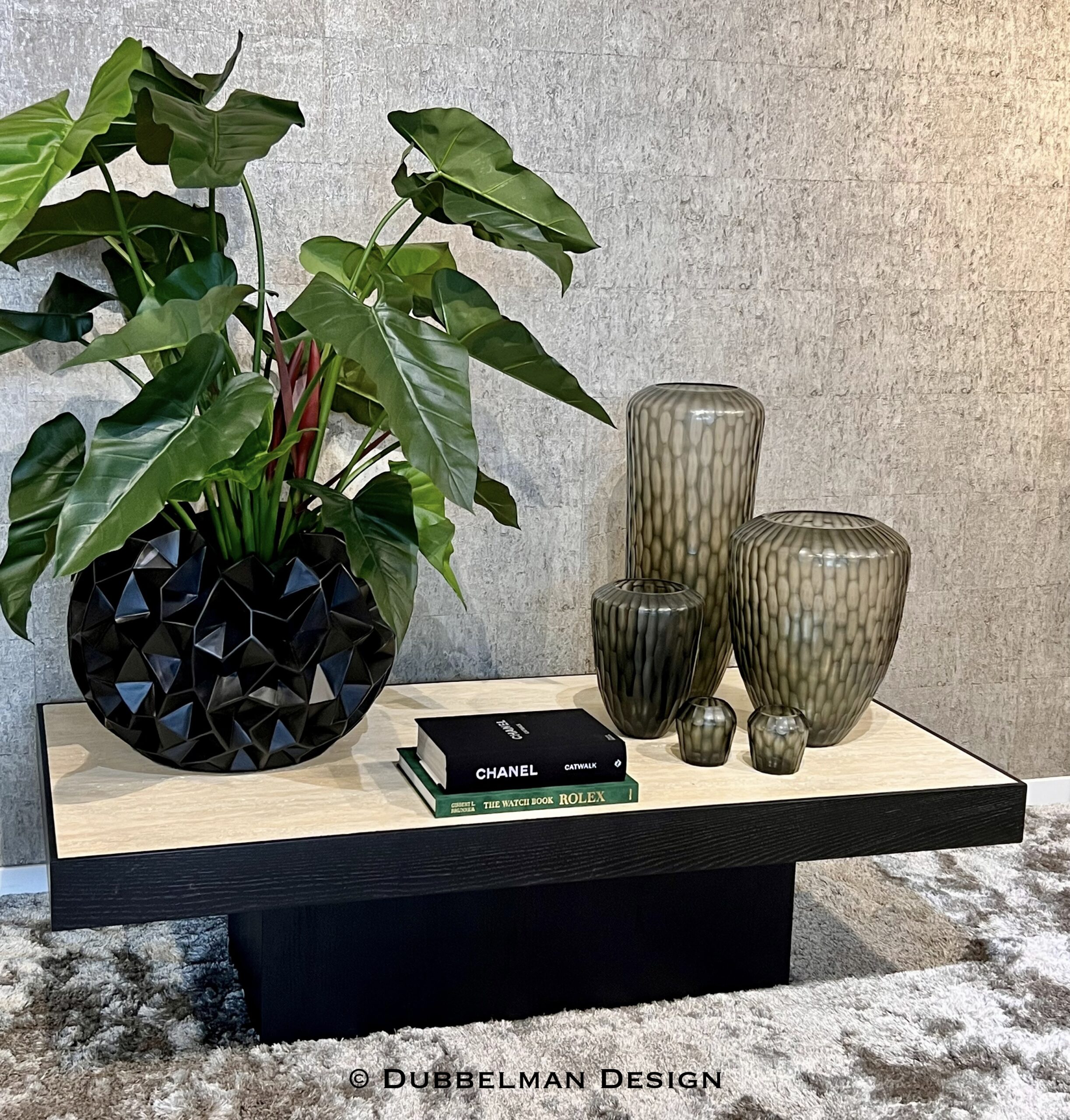 Prachtige salontafel in zwart eiken met een schitterend marmerlook blad.