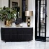 Prachtig tv-meubel in zwart mango met een gouden accent en een schitterend wit marmer blad.